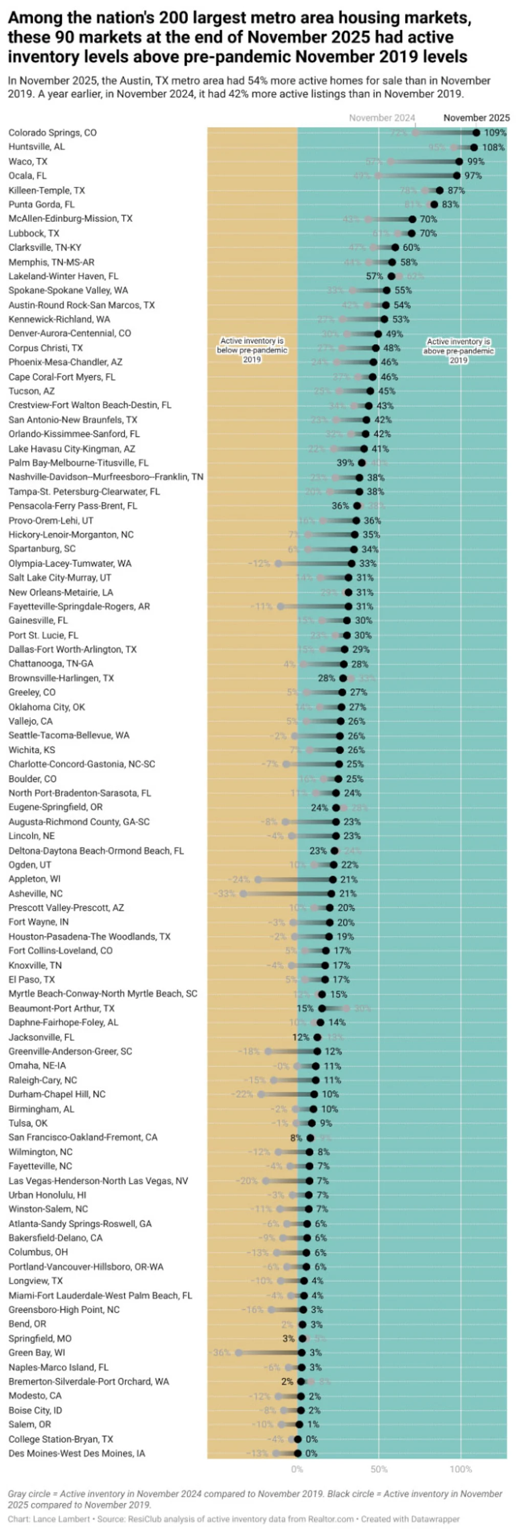 januari 2025: 41 van de 200 grootste huizenmarkten in stedelijke gebieden bevonden zich weer boven het voorraadniveau van vóór de pandemie van 2019.