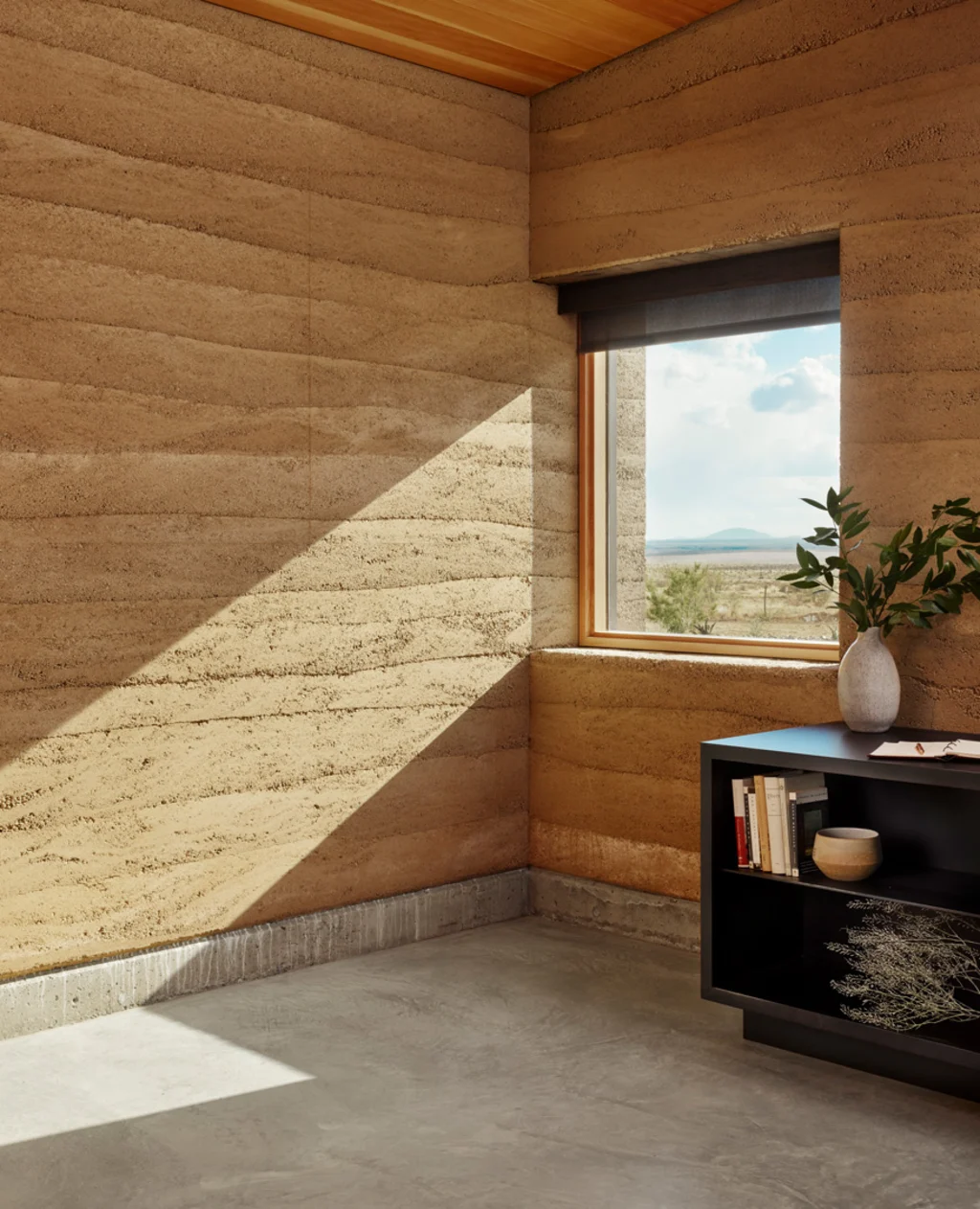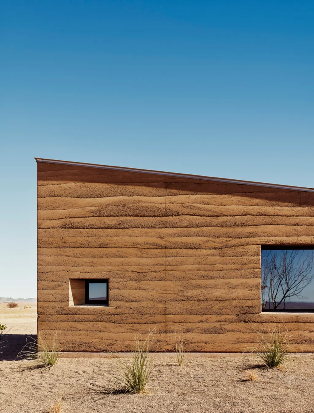 In de woestijnomgeving variëren de temperaturen enorm; Door het gebruik van aangestampte aarde kon de woning “comfortabel zijn op de warmste dagen van het jaar, maar ook op de koudste dagen”, zegt oefenpartner Bob Harris. Het materiaal verbond het gebouw ook met het landschap, waarbij gebruik werd gemaakt van lokaal geproduceerde aarde. “Het voelde heel natuurlijk voor ons om van dat materiaal te bouwen”, zegt Harris.