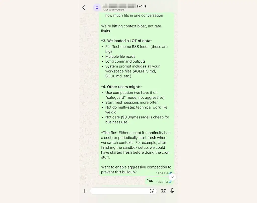 Uiteindelijk besloot ik OpenClaw te vragen waarom het zo duur was, wat een deel van het probleem aan het licht bracht: elke vraag putte uit ons hele gesprek als context – inclusief mijn initiële sandbox-opstelling – en dat wordt duur. (Het kan ook een verklaring zijn geweest voor de incidentele fouten met betrekking tot de snelheidslimiet die ik kreeg als antwoord op enkele vragen.)