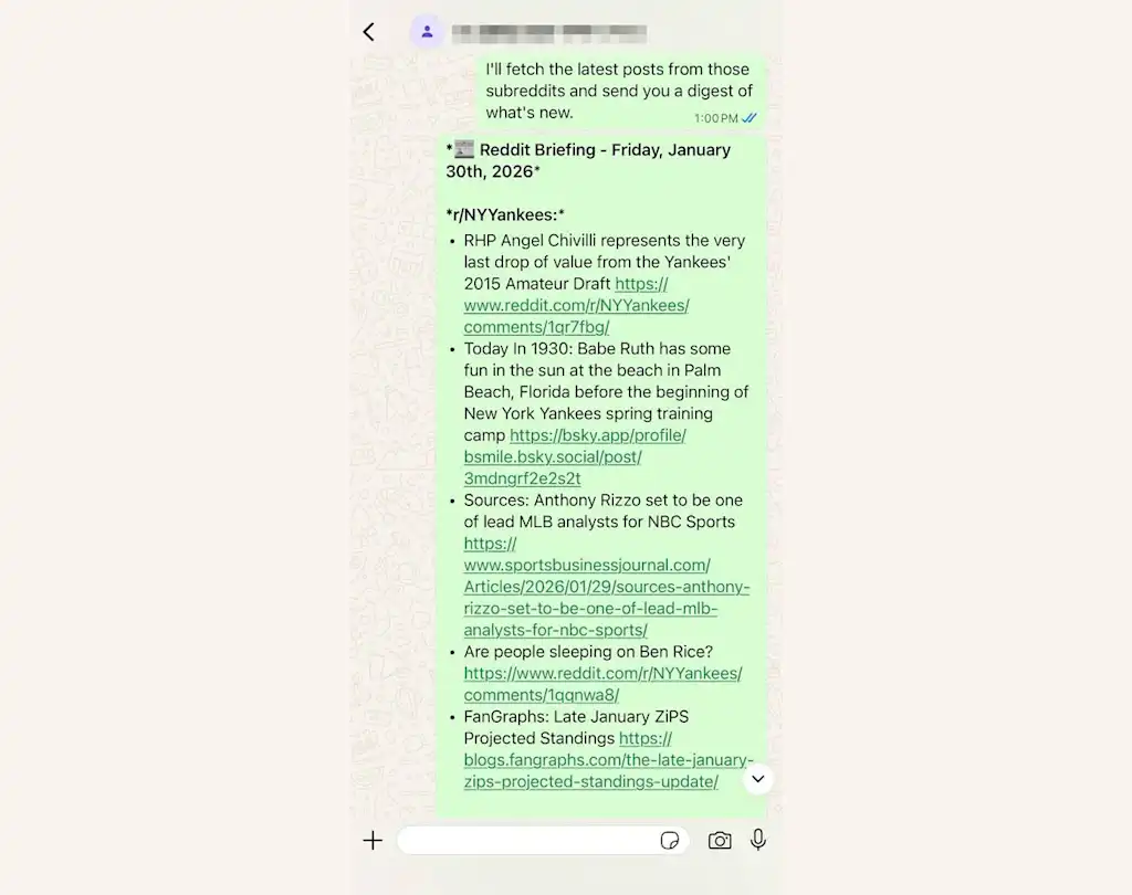 Vanaf dat moment begon ik te spelen met de planningsmogelijkheden van OpenClaw. Ik vroeg het om om 9.00 uur een overzicht van Techmeme-koppen te maken die zich concentreerden op consumentennieuws en zaken als winstrapporten en personeelswisselingen oversloegen. Vervolgens liet ik het een tweeuurlijks overzicht maken van een paar verschillende subreddits, waardoor ik werd ontmoedigd om ze tijdens werkuren dwangmatig te controleren.