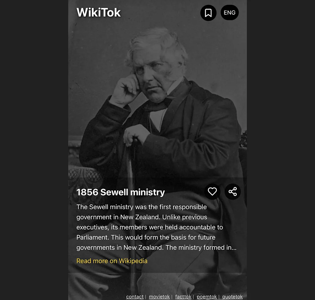 WikiTok: Deze slimme website neemt de verslavende oneindige scroll van TikTok en past deze toe op willekeurige Wikipedia-pagina’s, zodat je er doorheen kunt swipen totdat iets je interesse trekt. De ervaring is veel minder sprankelend, maar dat is ook precies het punt. Probeer het te gebruiken voordat je naar bed gaat. (Web)