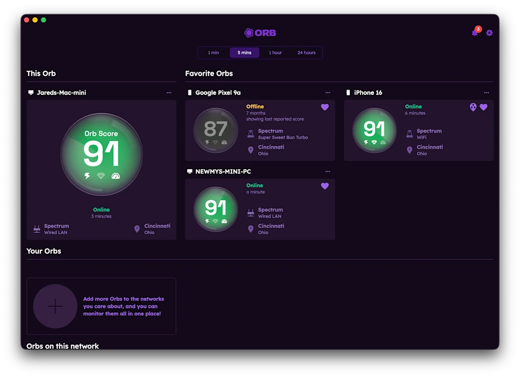 Orb: De meeste internetsnelheidstesttools geven u slechts een momentopname van de upload- en downloadsnelheden. Met Orb kunt u in plaats daarvan de hele dag aanhoudende snelheidstests uitvoeren, waardoor u een duidelijker beeld krijgt van de algehele betrouwbaarheid. Je kunt de app zelfs op meerdere apparaten in huis instellen om te zien waar de verbinding het zwakst is. (Windows, Mac, iOS, Android)