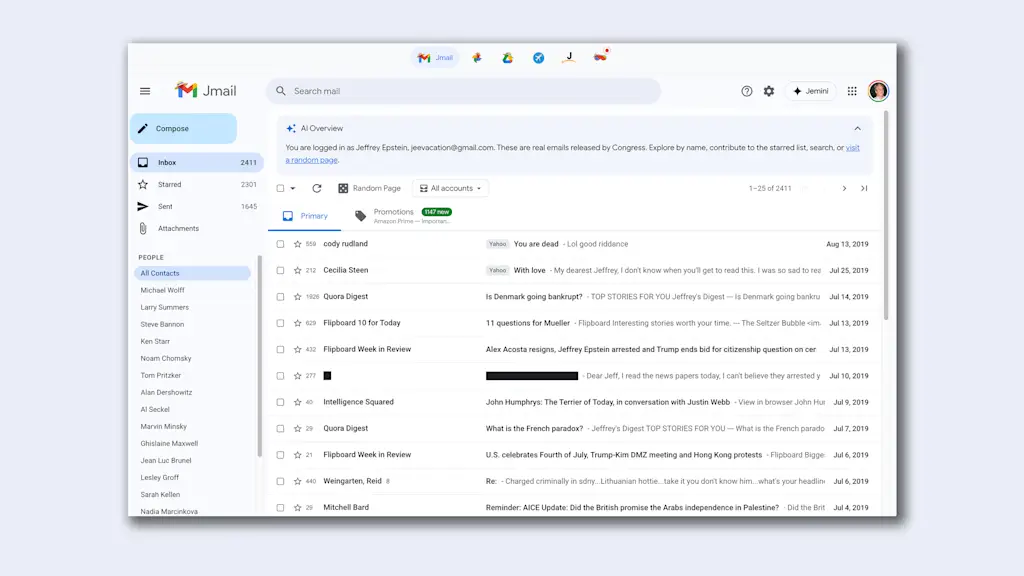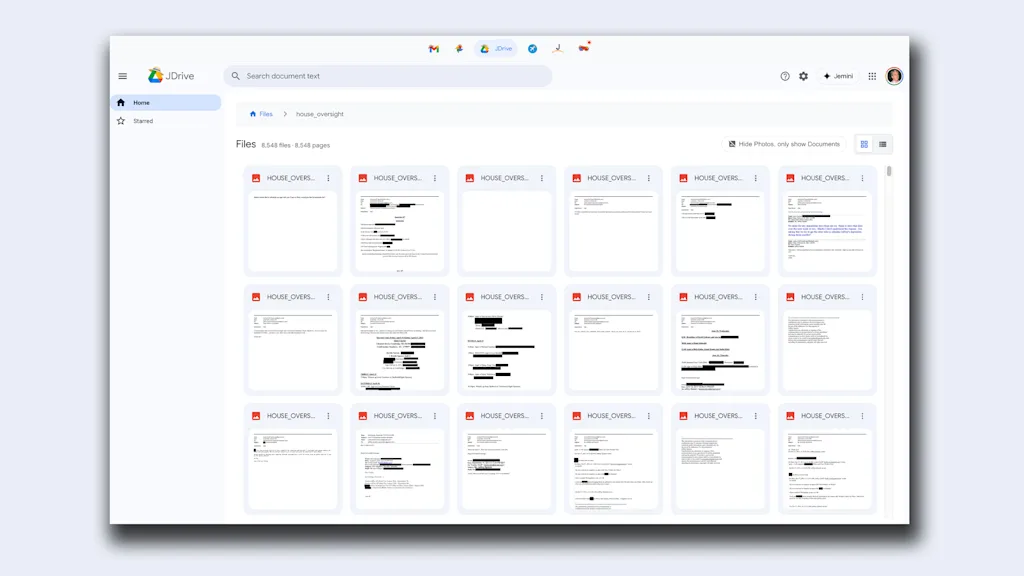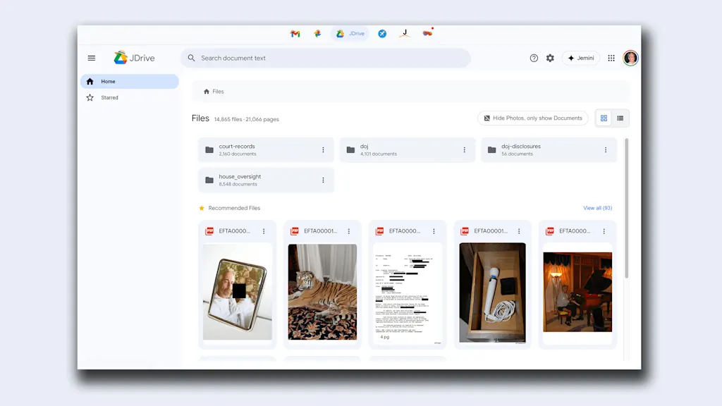 Gemaakt door technologen Riley Walz en Luke Igel, er is geen betere manier om deze vuile Himalaya te verkennen. Het maakt gebruik van een gebruikersinterface die je al kent: Gmail en de rest van Gmail-apps, zoals Drive. De makers hebben het sinds de lancering stilletjes bijgewerkt en zelfs een AI belde Jemini om in de media te zoeken, om aan te tonen dat de DOJ beweert dat het vanwege technische beperkingen onmogelijk is om in bepaalde materialen (zoals handgeschreven notities) te zoeken, is simpelweg niet waar.
