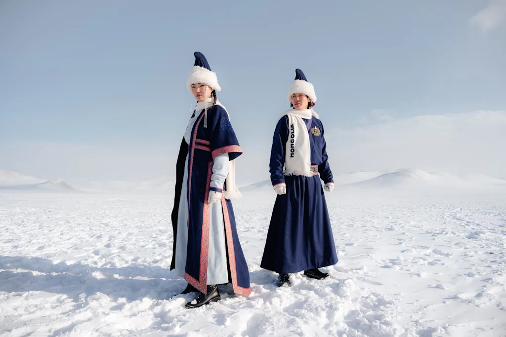 Mongoolse atleten zullen sportkleding dragen die door het merk is gemaakt Goyol kasjmierdat zowel een lijn casual skitruien als een prachtige collectie ceremoniële uniformen heeft geproduceerd. De truienlijn is geïnspireerd op de westerse après-ski-esthetiek, vermengd met verwijzingen naar het Mongoolse nomadenleven, inclusief beelden van een ger (eenmanstent), schaapskooien en een paard.