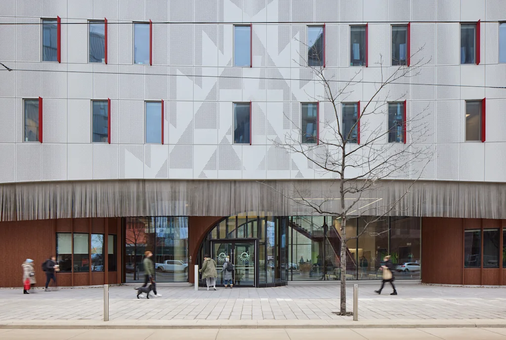 Bouwmaterialen maken andere referenties in de ontwikkeling, waaronder veelkleurige bakstenen die de vorm van een geweven mand nabootsen, en geprefabriceerde betonnen panelen met een patroon naar de bast van inheemse berkenbomen.