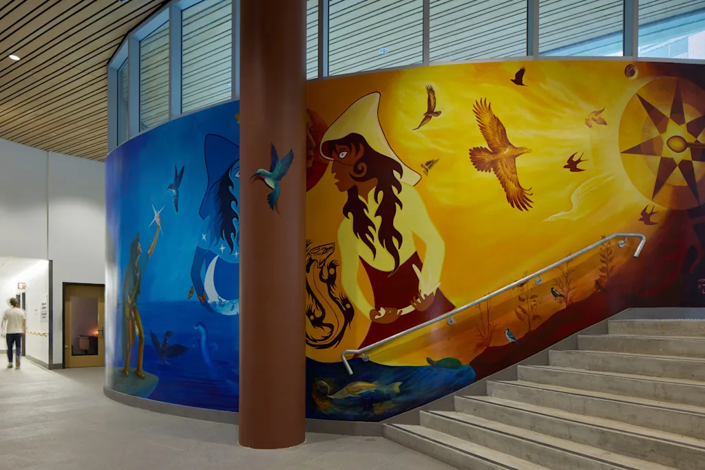 De rand rond het gezondheidscentrum is misschien wel de meest betekenisvolle ontwerpkeuze en het meest representatief voor wat deze ontwikkeling zo uniek maakt. Het is geïnspireerd op de sjaals die gebruikt worden door chique danseressen bij inheemse powwows, en ook door het geluid gemaakt door de jingle-jurken traditioneel gebruikt tijdens genezingsrituelen.