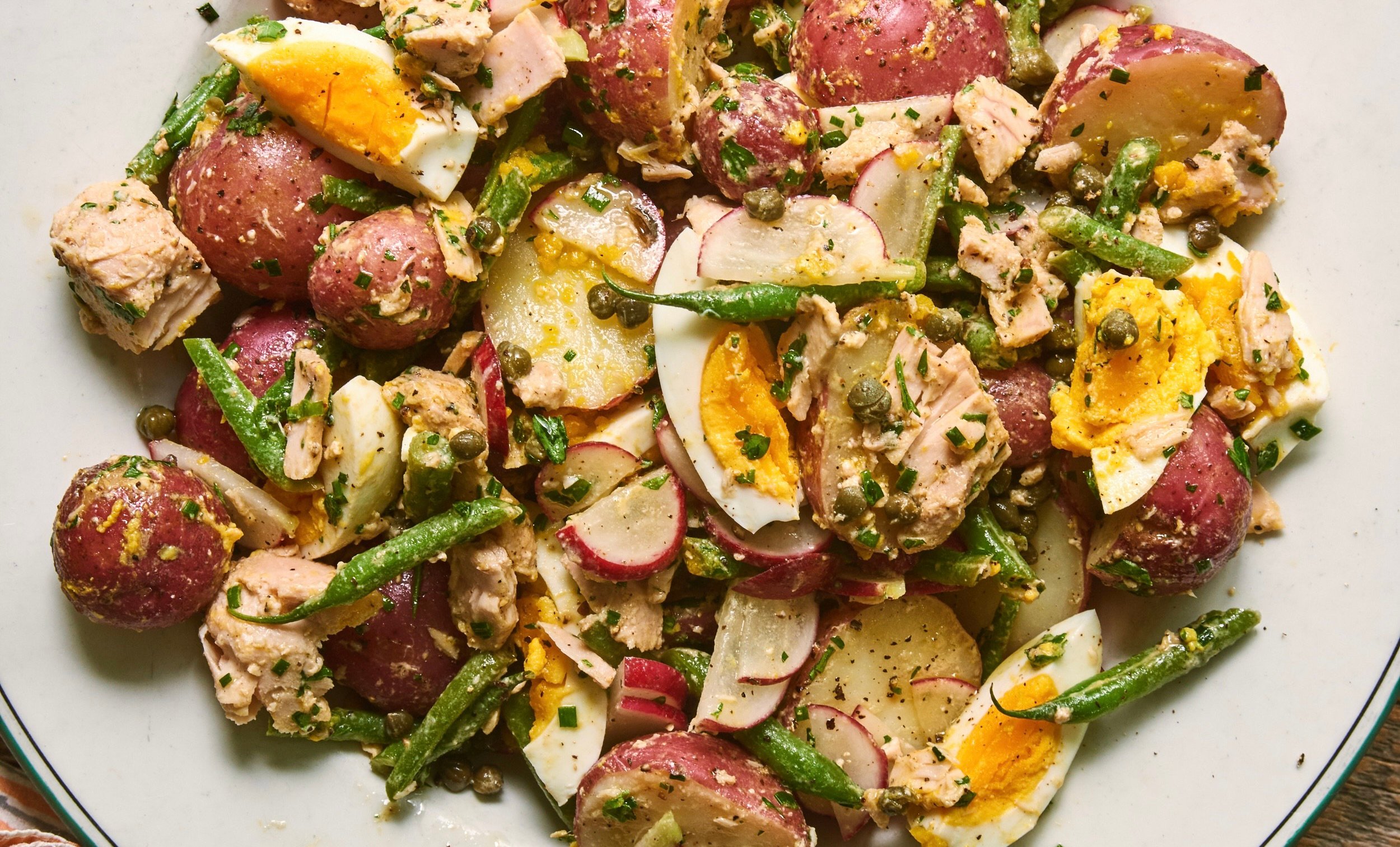 Dit recept komt bij ons vandaan Melina Hamerdie het een “Niçoise-achtige” aardappelsalade noemt, omdat het wordt opgevoerd met tonijn, eieren en andere klassieke Niçoise-elementen. “Je krijgt die heldere, krachtige smaken”, zegt Melina. Het past zich gemakkelijk aan het seizoen aan, voegt ze eraan toe, en suggereert winterradijsjes – zoals paarse daikons of watermeloenradijsjes – als je het deze maand maakt. “Je kunt de sperziebonen ook ruilen voor twee kopjes gesneden escarole of Chinese kool, en ik ben altijd fan van ontdooide diepvrieserwten. Je hoeft ze niet verder te koken – gooi ze er gewoon in!”