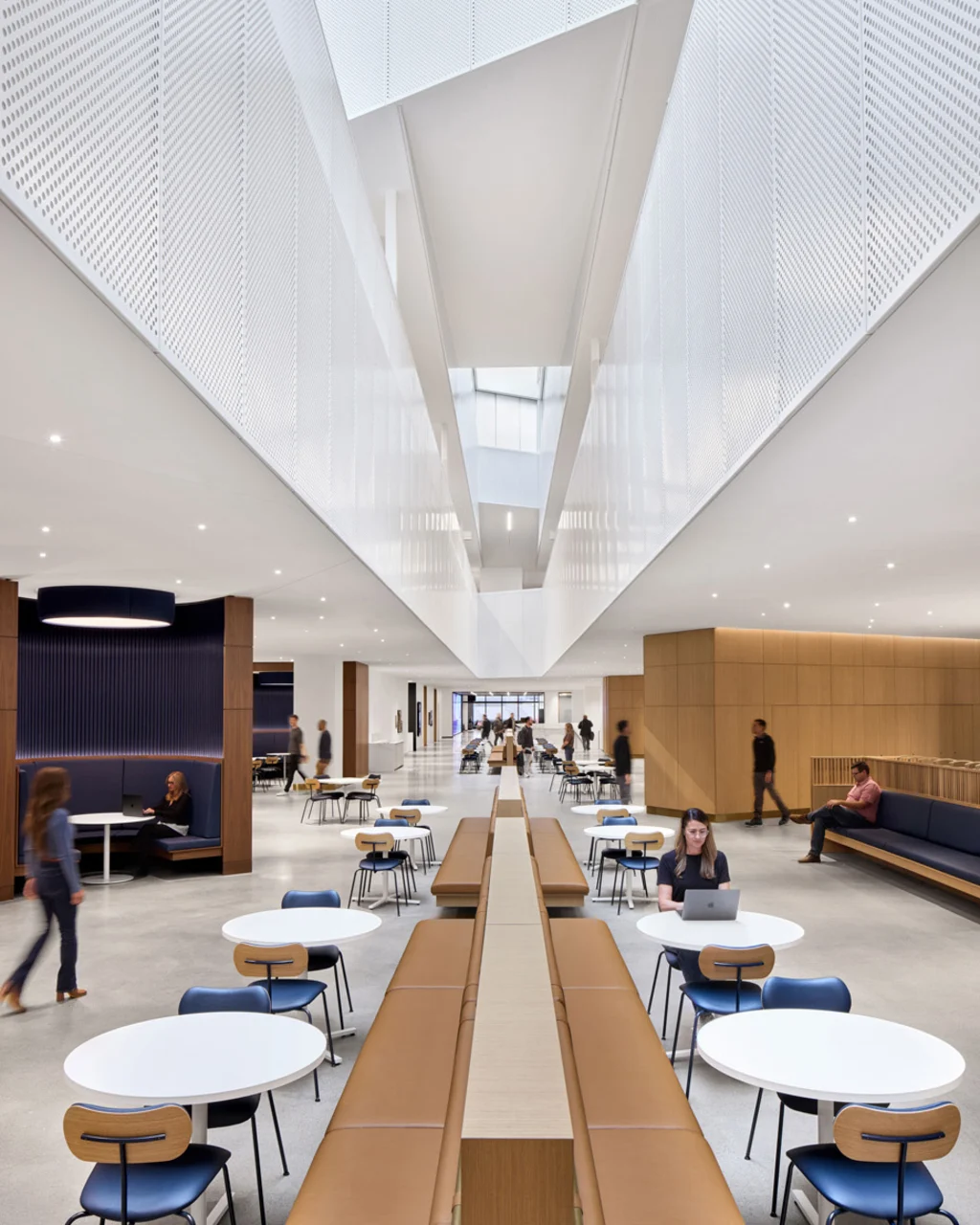 Jim Dobleske, CEO van Ford Land, de vastgoedtak van het bedrijf, zegt dat het hoofdkantoor is ontworpen om samenwerking en een flexibelere benadering van kantoorwerk mogelijk te maken – twee vereisten na de pandemie. Belangrijker nog is dat het gebouw bedoeld is om de manier waarop verschillende takken van het bedrijf samenwerken te stroomlijnen, waarbij gebruik wordt gemaakt van nabijheid, gedeelde middelen en de eenvoud van één gebouw om historische silo’s af te breken.