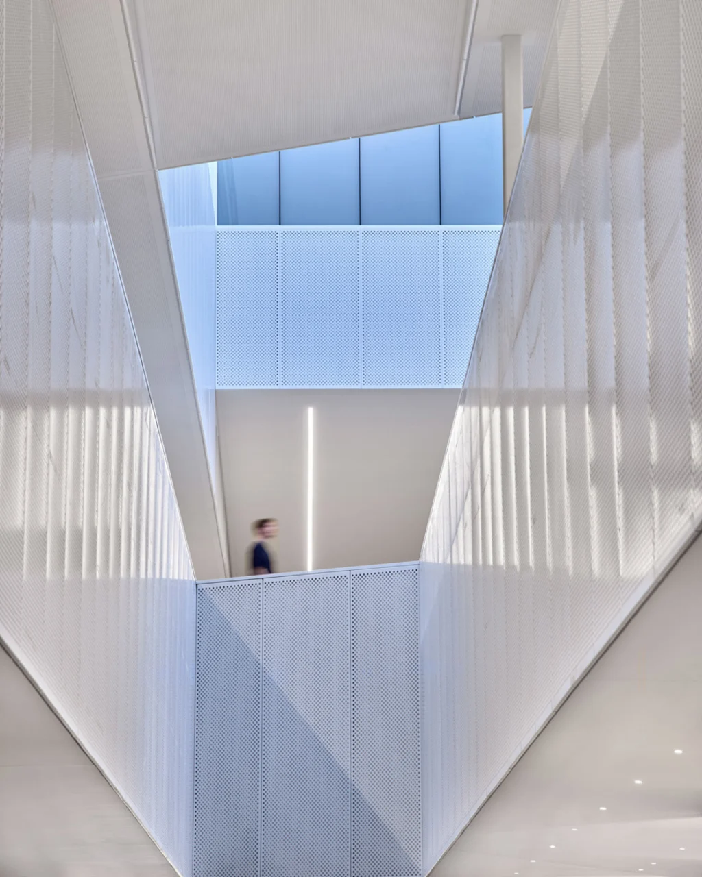 Deze poging tot openheid strekt zich uit tot de architectuur zelf. Terwijl hij door de rechte ruggengraat loopt die tussen de drie zeshoeken van het gebouw loopt, wijst Dykers omhoog naar een smal atrium dat door de bovenste drie verdiepingen van het gebouw loopt. Een dakraam zorgt voor licht naar beneden en mensen op elke verdieping kunnen een glimp opvangen van wat er elders gebeurt, zelfs als ze niet over de badge beschikken om door de deur te komen.