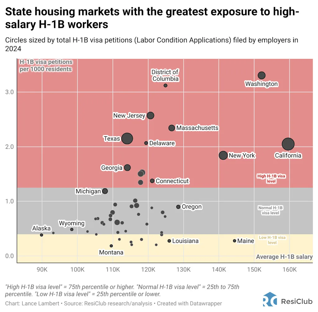 De staten met de hoogste blootstelling aan hoogbetaalde H-1B-werknemers – en de vraag naar woningen en huur die zij genereren – zijn onder meer Washington, Californië, New York, New Jersey, Texas en het District of Columbia.