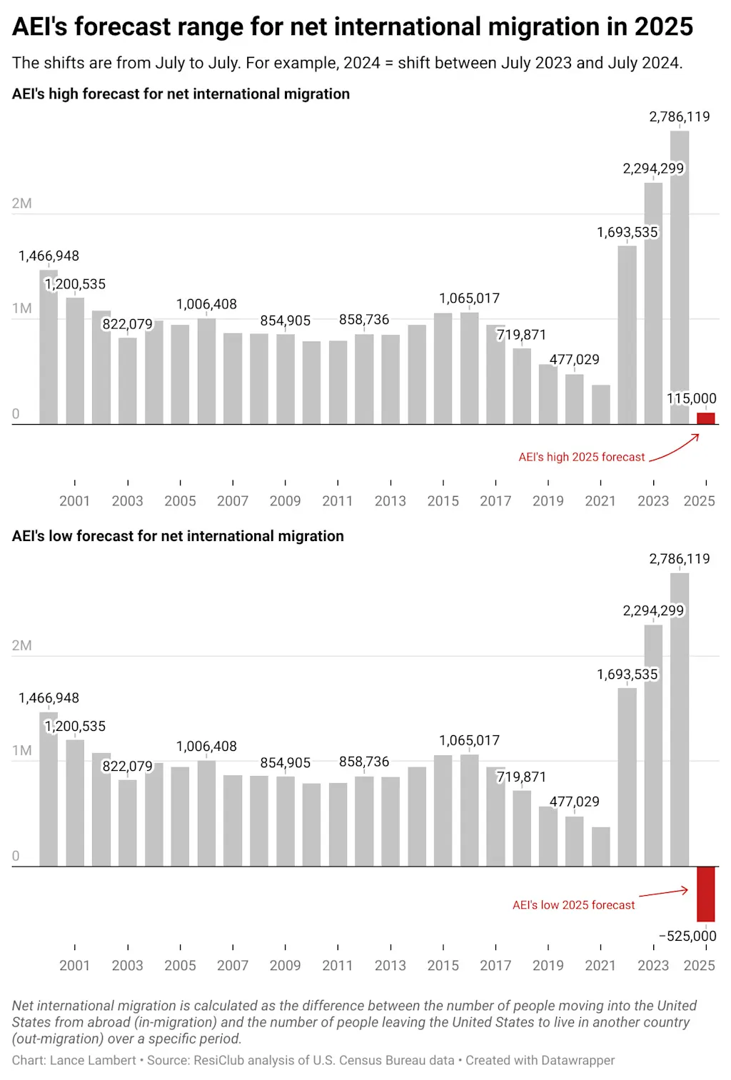 Die internationale migratiegolf ligt uiteraard nu achter ons. De laatste tijd zijn de grensovergangen sterk gedaald. A Julivoorspelling door onderzoekers van AEI verwacht dat de netto internationale migratie in 2025 ergens tussen de +115.000 en -525.000 zal liggen.