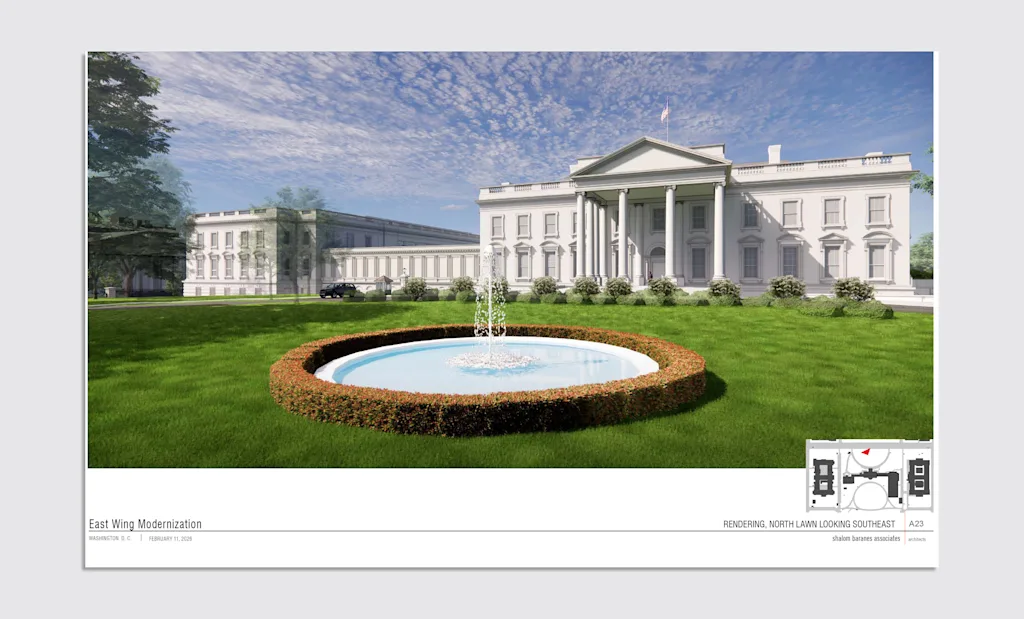 De nieuwste renderingen voor een nieuw voorgesteld gebouw op de plaats van de gesloopte Oostvleugel werden op 13 februari kort op de website van de National Capital Planning Commission geplaatst, en vervolgens verwijderd. De plannen vereisen een balzaal die veel groter is dan de rest van het Witte Huis. Zo groot zelfs dat het de vorm van de South Lawn-oprit verpest.