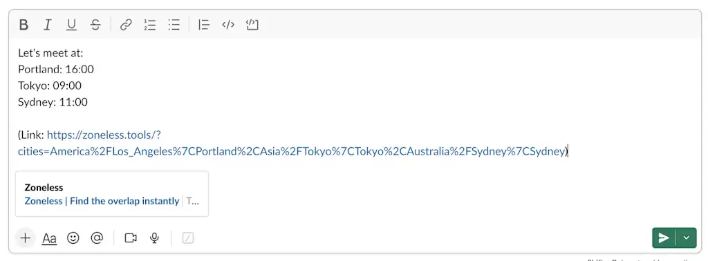 ☝️ Het enige wat u hoeft te doen is op de door u gekozen tijd te klikken. Er wordt dan een samenvatting naar het klembord van uw apparaat gekopieerd, inclusief de tijden en een link terug naar de dienst, voor het geval iemand anders een meer visuele weergave wil. Dat geeft de mensen met wie u coördineert ook de kans om de tool zelf te gebruiken om, indien nodig, een ander tijdstip voor te stellen.