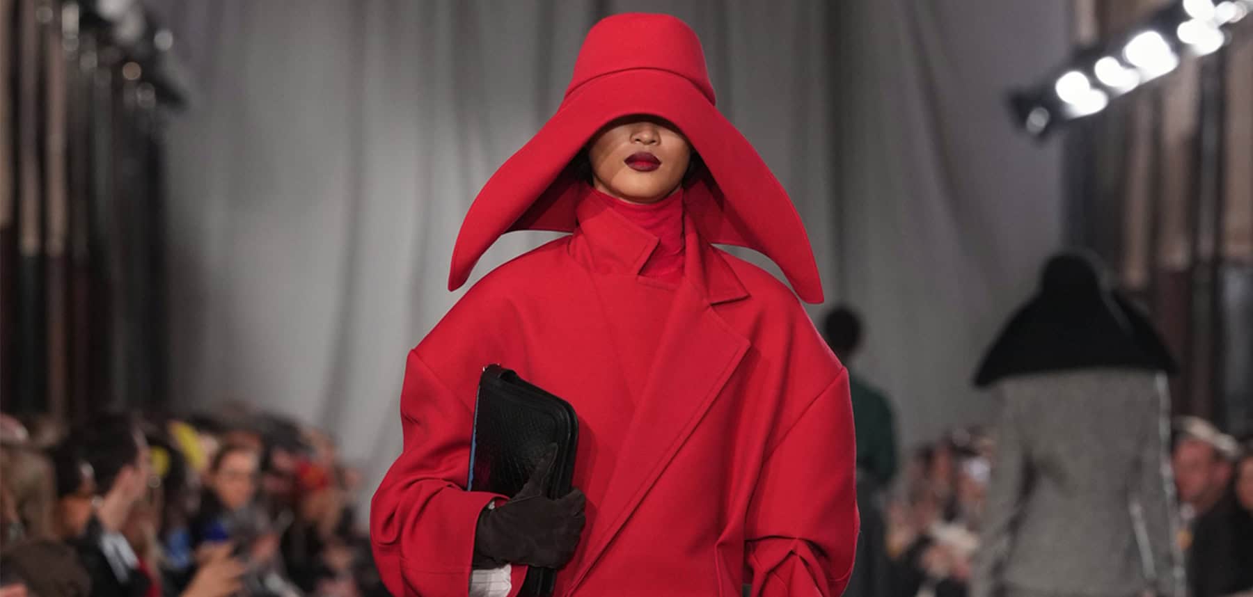 Tegen het einde werd het palet scherper: robijnrood donker en karmozijnrood helder verschenen in een sculpturale wollen jas en hoedenset, gevolgd door een vampirische fluwelen jurk met een kraag van nepbont. De finale leunde volledig in de avond: een gedrapeerde jurk met één schouder, een flapperachtig crèmekleurig hemdje onder zwarte mesh-kralen en een zwierige zwarte wollen jas met hertoginnenmouwen en zwaaiende druppelvormige kralen. Zeer chique.
