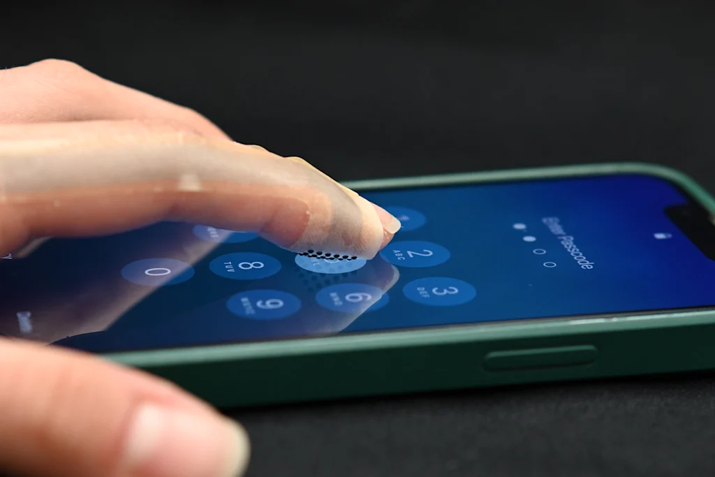 Als u een klein draagbaar apparaatje op uw vingertop schuift en over een glad oppervlak zoals een touchscreen schuift, kunt u digitale texturen voelen zoals denim of mesh.