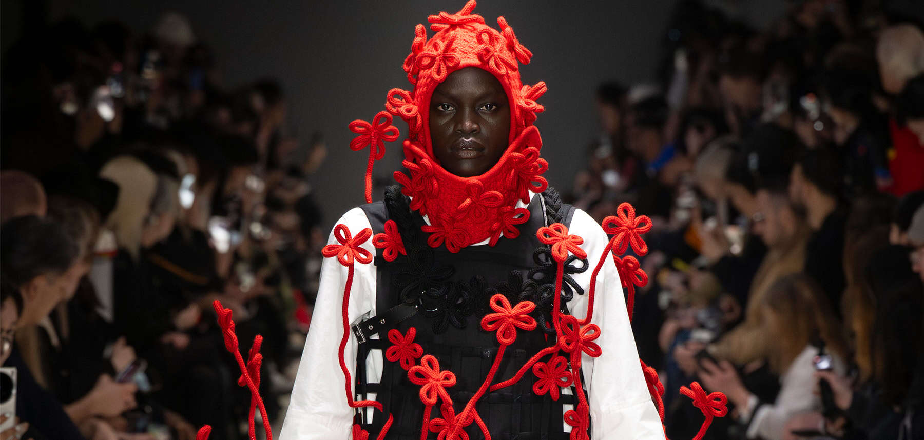 Er hing een angstige sfeer in de Noir Kei Ninomiya zaterdagmiddag laten zien. Muzikanten Hakushi Hasegawa en Tokutaro Hosoi zorgden voor een dreigende soundtrack terwijl de structurele wonderen van de ontwerper over de catwalk slenterden. Modellen kwamen met sculpturale, gevlochten haarstukjes die hun gezicht verborgen hielden, waarvan sommige versierd waren met miniatuurvechtende beren en wolven, eveneens gemaakt van haar. De verbeeldingskracht van Ninomiya kent geen grenzen en dit seizoen namen zijn ontwerpen briljante, nieuwe, bizarre vormen aan. Bolvormige, gekooide jurken zagen eruit alsof ze waren gemaakt van ninjasterren, of uitgroeiden tot cocoonende capes gemaakt van plastic uitgesneden in bloemen. Er ontstonden nog meer kooien met cartoonachtige bloemen die zwaaiden terwijl de modellen liepen. Eén bloedrode jurk leek op een griezelige wolk als iets uit een horrorfilm.