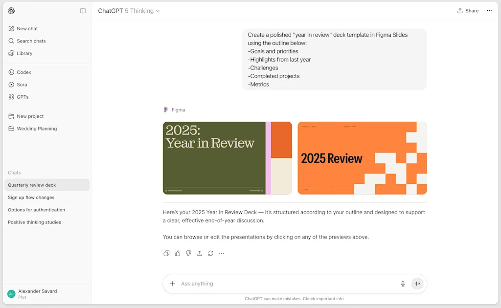 Canva en Figma hebben beide tools aangeboden om slidedecks te maken, een brainstorm of vrijwel alles wat je in ChatGPT wilt plakken, in een presentatie te veranderen. Beide diensten duiken in hun eigen sjablonen om visuele elementen te bouwen die als miniatuurweergaven kunnen worden bekeken. Van daaruit kunt u op een voorbeeld tikken om de hele diavoorstelling te bekijken. Het addertje onder het gras is dat je deze dia’s in beide gevallen niet echt verder kunt bewerken via een gesprek. De app-integratie brengt je na de vraag terug naar de stock-ChatGPT. In plaats daarvan verwijst het voorbeeld, net als Target, u terug naar hun respectievelijke apps.