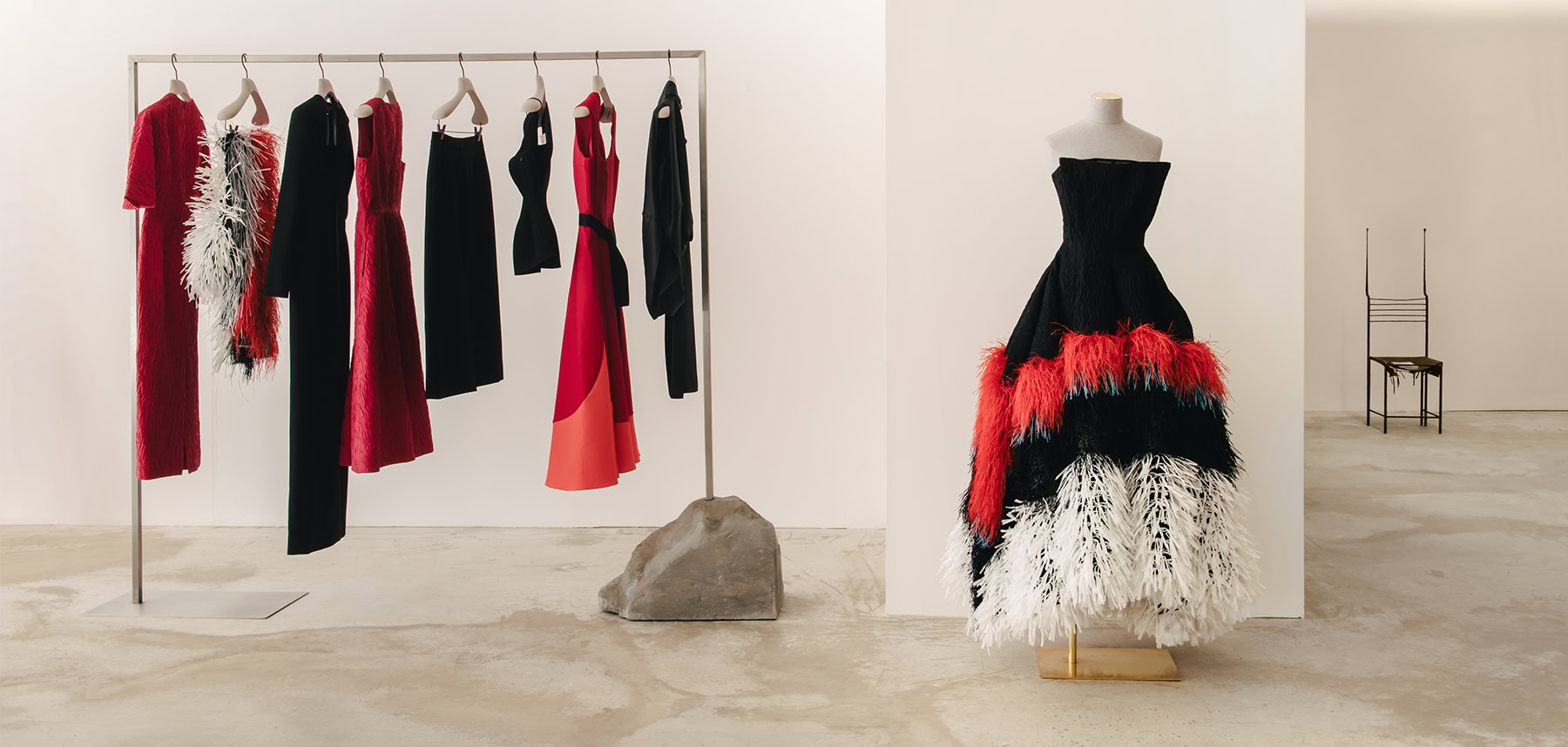 Te midden van de verzamelbare meubels en kunstwerken kunnen shoppers dit vers-van-het-atelier verwachten SS26-collectie wat tevens het 20-jarig jubileum van de ontwerper markeerde. Geïnspireerd door het werk van de Britse modernistische beeldhouwer Barbara Hepworthvertaalde de collectie haar fascinatie voor negatieve ruimte in kleding door middel van gebogen uitsnijdingen en sculpturale silhouetten. Lasergesneden gebonden fluweel creëerde precieze openingen over het hele lichaam, terwijl raffia werd gebruikt om volumineuze beugelrokken en getextureerde stola’s te maken die met dramatisch gemak bewogen. Elders balanceerden ballonbroeken en crinolinejurken met panniers een theatraal volume met verrassende draagbaarheid – een herinnering aan Ilinčić’s al lang bestaande talent voor moderne grandeur.