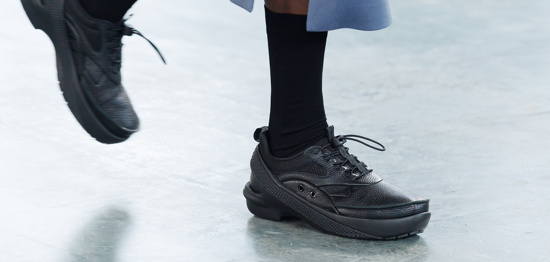 Show-stoppende samenwerkingen op het gebied van schoenen zijn geen nieuws voor Kostadinov – denk maar aan het wereldwijde succes ervan Asics daalt – maar dit debuut markeerde zojuist een geheel nieuwe mijlpaal voor de CSM-aluin. Kostadinov maakt gebruik van de erfenis van Crocs op het gebied van alledaagse functionaliteit en heeft een sculpturaal silhouet gecreëerd dat industriële architectonische inspiraties en utilitair ontwerp perfect combineert. Het resultaat is een dikke, sneakerachtige zool die uitloopt in een bovenwerk van mesh-korrelig leer dat doet denken aan traditionele schoenontwerpen, maar met een vleugje Crocs-core ademend vermogen.