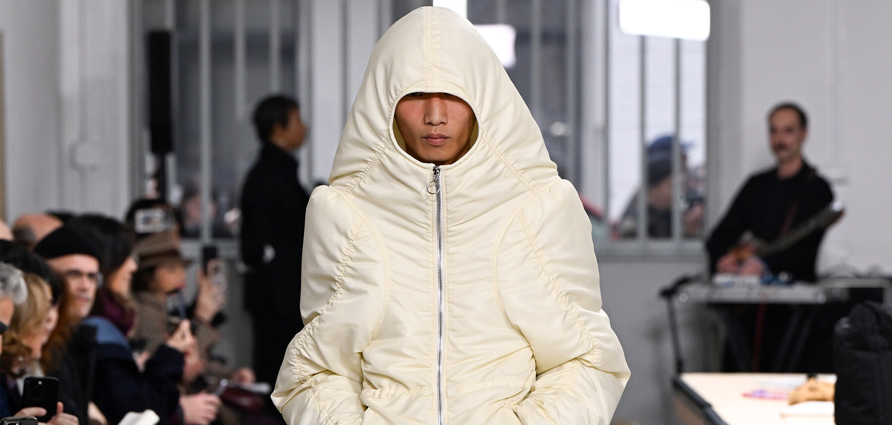 Bovenkleding dreef de collectie over heren- en dameskleding. Hoekige jassen met ingeschoven armsgaten creëerden sculpturale, beschermende vormen, geïnspireerd op overlevingskleding uit de Arctische regio zonder letterlijk te worden. Maatwerk met krijtstreep doorsneed de show met precisie, vaak gecombineerd met dijhoge laarzen die de beenlijn verlengden en het silhouet scherper maakten.
