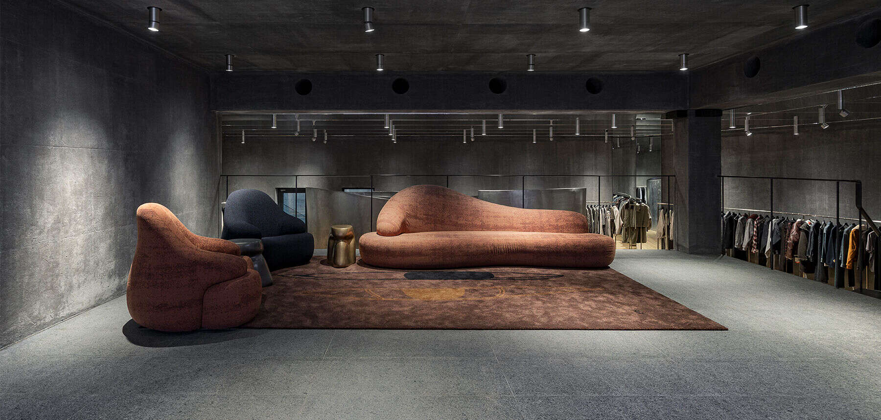 Ontworpen in samenwerking met de Zwitserse studio Stocker Lee ArchitectenHet ontwerp van de winkel vertaalt de creatieve filosofie van het merk in bouwvorm. Madame Woo liet zich leiden door het architecturale principe dat “het horizontale vlak functioneel is, terwijl de verticale structuur emotioneel is”, wat betekent dat het bewegen door elke verdieping een ervaringsreis voor het winkelend publiek met zich meebrengt. Ze begon met de herenkledingboetiek en werkte samen met de kunstenaar Dongwook Choi om meubelstukken te creëren die de silhouetten van verschillende lichaamsdelen weerspiegelen.