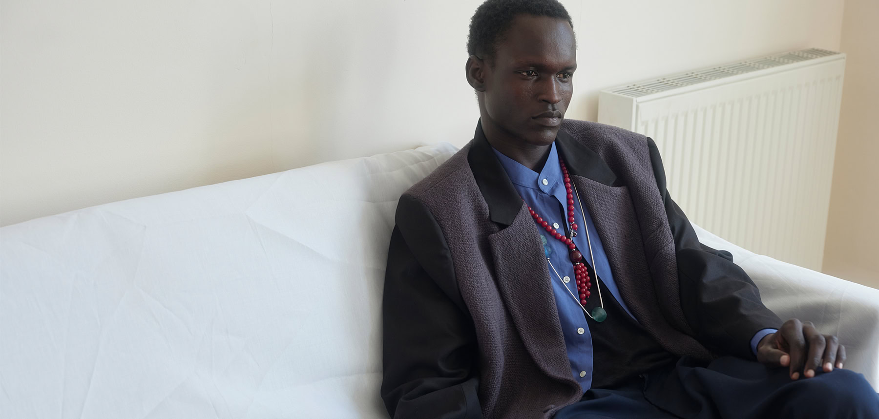 Er loopt een dualiteit doorheen – Brits en Kameroens, op maat gemaakt en relaxed – maar niet altijd bewust. “Ik ben opgegroeid en woon in Londen, dus de manier waarop we ons hier kleden zal altijd mijn werk beïnvloeden. Mijn vriend vertelde me ooit dat de gedempte kleuren en op maat gemaakte silhouetten waar ik naar neig, echt mijn Britse achtergrond weerspiegelen. Ik was me hier niet van bewust totdat ik dat hoorde.” Nu is het bewuster. “Ik hou er echt van om te spelen met het balanceren van mijn Kameroense achtergrond en Britse gevoeligheden om een nieuw beeld te creëren van wie die man zou kunnen zijn.”