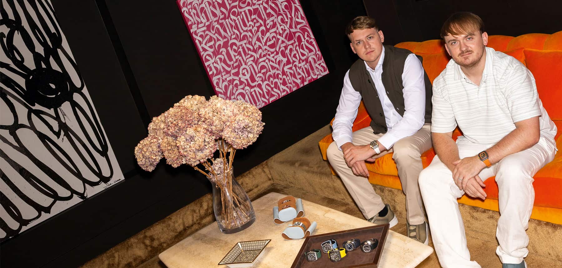 Als ik ze tegenkom in hun afspraakkamer, een cocon met zwarte muren in Maddox Street in Mayfair, met oranje fluwelen banken en een opvallend schilderij van de bruisende Brits-Nigeriaanse kunstenaar Ontstoken Terwijl ik naar ons grijns, voelt het alsof ik in een samengestelde botsing van chaos en controle terecht ben gekomen. De sfeer is onmiskenbaar die van hen: speels, zelfverzekerd, bijna als een galerij. Harvey is aan de telefoon en krijgt een telefoontje van iemand die vraagt ​​of hij crypto gebruikt. Jacob legt een vers onderhouden exemplaar neer Rolex Day-Date alsof het een museumstuk is. Er speelt muziek. Ik denk dat het Drake is. Het is 11 uur.