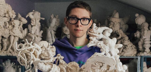 Halverwege de jaren 2010 bevond Card zich in een positie om een ​​jongere generatie creatievelingen te steunen die hem inspireerden – of dat nu een jonge Charles Jeffrey, Ryan Lo of Marta Jakubowski – door uitgebreide catwalksets te ontwerpen. “Ik gaf een groot deel van mijn financiën en energie aan deze kinderen, die erg dankbaar waren, maar tegelijkertijd was het een keerpunt voor mij”, zegt hij. Tegen het einde van het decennium begon hij zich te concentreren op zijn eigen kunst, waarbij hij het proces op gang bracht als onderdeel van een grote tentoonstelling in Philips veilinghuis. Gerechtigd Hysterischde show van 2019 bevatte artiesten als Cindy Sherman, Yayoi Kusama en zijn oude held Paul McCarthy. De ruimte was ingericht als een psychedelisch droomlandschap en was doorspekt met de sculpturen en schilderijen van Card. “Het idee was nogal arrogant, als ik eraan terugdenk”, zegt hij met een glimlach. “Zoals: ‘Dit zijn nu mijn tijdgenoten.’”