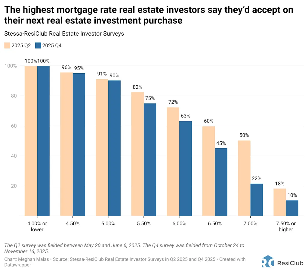 - 63% van de ondervraagde vastgoedbeleggers zei dat ze bij hun volgende aankoop alleen een hypotheekrente van 6,00% of lager zouden accepteren.