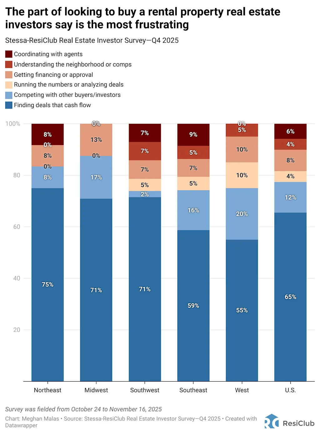 - Twee derde van de vastgoedinvesteerders (65%) zegt dat het meest frustrerende deel van het koopproces het vinden van deals is met een cashflow; dat aandeel is zelfs nog hoger onder verhuurders in het Westen (75%).