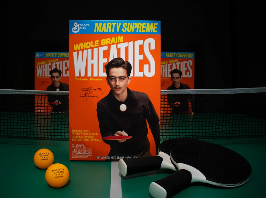 De voorkant van de Wheaties-box heeft gediend als een eregalerij voor enkele van de grootste atleten aller tijden, van honkbalster Lou Gehrig tot bokser Muhammid Ali, basketballegende Michael Jordan en zevenvoudig Olympisch gouden medaillewinnaar Simone Biles. Nu siert een nieuw gezicht het heilige oranje kader van de doos: Marty Mauser, de fictieve pingpongspeler gespeeld door Timothée Chalamet in de aankomende film van A24 Marty Supreme.